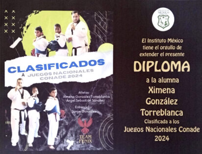 El Instituto México, se enorgullece de su alumna Ximena González Torreblanca, quién representará al Estado de Guerrero por 2da ocasión consecutiva en los Juegos Nacionales CONADE en la disciplina de Taekwondo, próximos a celebrarse en el estado de Jalisco, hicieron extensiva la felicitación al profesor Jorge González, titular del taller de Taekwondo en dicho Instituto.