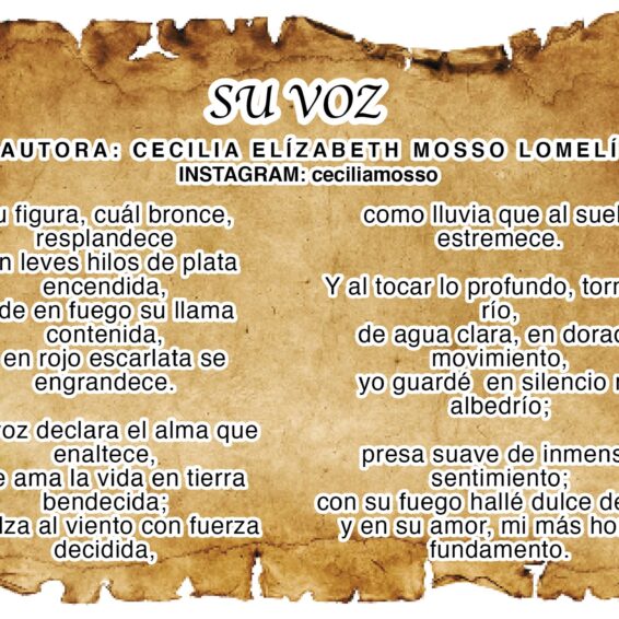 ColaboracionesSu VozAutora: Cecilia Elizabeth Mosso Lomelí Su figura, cuál bronce, resplandece con leves hilos de plata encendida, arde en fuego...Leer más...