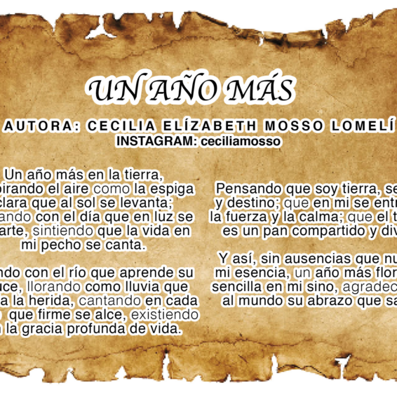 ColaboracionesUn año másAutora: Cecilia Elizabeth Mosso Lomelí Un año más en la tierra, respirando el aire como la espiga clara que...Leer más...