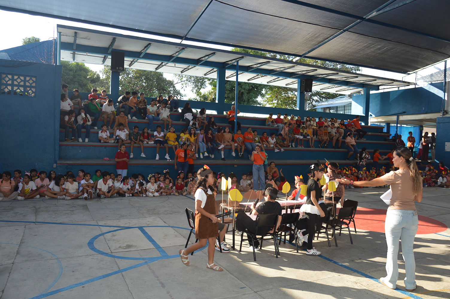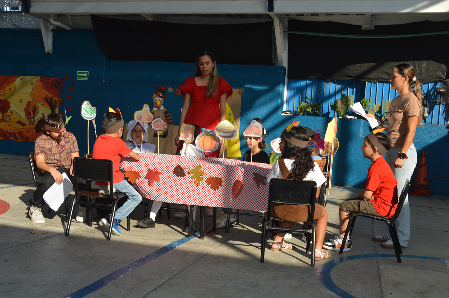 Los niños disfrutaron con gran ilusión la dinámica de “ponerle las plumas al pavo”, una actividad que, entre risas y trabajo en equipo, reforzó habilidades motrices y vocabulario en inglés. Pero el momento más conmovedor llegó cuando los estudiantes escenificaron el verdadero propósito de Thanksgiving. A través de pequeñas dramatizaciones llenas de ternura, expresaron aquello por lo que están agradecidos: su familia, sus compañeros, sus maestros, los aprendizajes diarios y los momentos compartidos que hacen de la escuela un lugar donde se sienten seguros y felices.