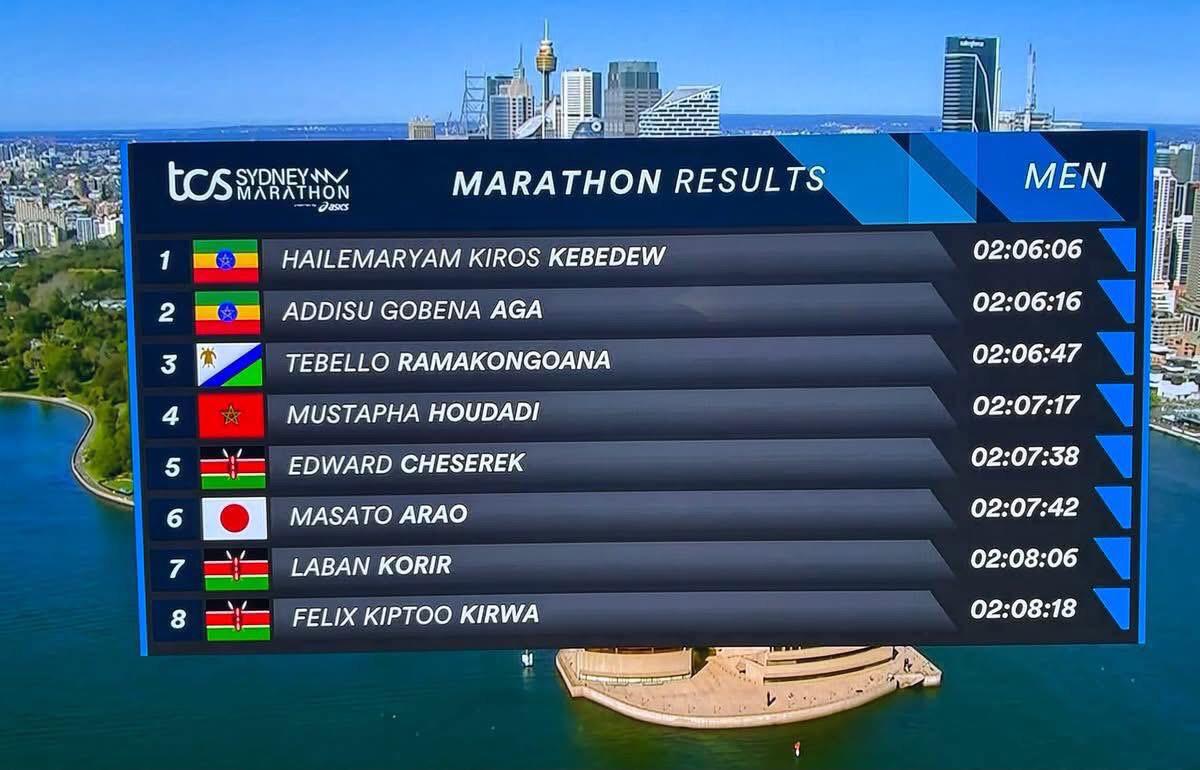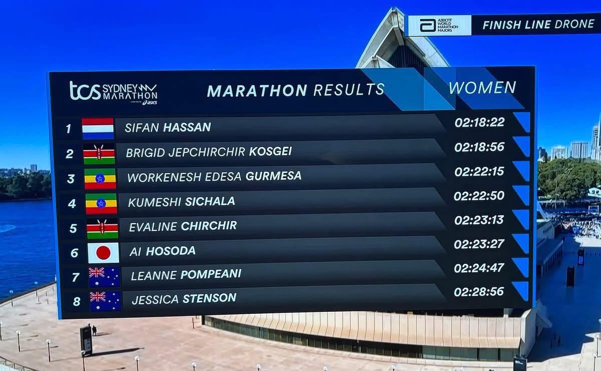 Horas antes por el horario terrestre, Sídney vio su primer major y ahí lució la etíope naturalizada Holandesa Sifan Hassan (2:18:22), cortando el listón y seguida de la keniana Brigid Jepchirchir Kosgei (2:18:56) y la etíope Workenesh Edesa Gurmesa (2:22:15), por los hombres, el cronometro de oro fue frenado por el etíope Hailemaryam Kiros Kebedew (2:06:06), seguido de su compatriota Addisu Gobena Aga (2:06:16) y de Tebello Ramakongoana (2:06:47), entre los mexicanos y propiamente de Acapulco, asistió Javier Salado Santiago que lo terminó en 3hr 48min 09 seg. Posesionándose en el lugar 360 de cat (55-59) y el lugar 9577 de 32844 participantes.
