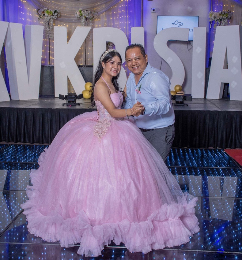 Posterior a la misa, la fiesta se trasladó al Salón Luxor Palace, donde la música, la comida y la diversión no faltaron. Krissia Irene bailó el tradicional Vals con miembros de su familia y disfrutó de un baile moderno con su hermano Sergio Mateo y sus Chevaliers.