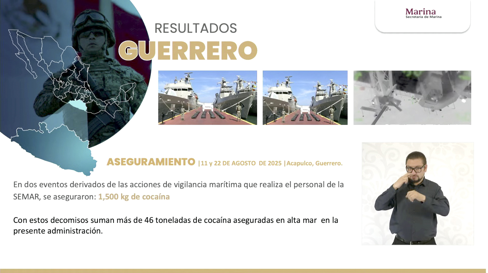 Asimismo, destacó que personal de la Marina, en dos acciones de vigilancia marítima, aseguró en Acapulco mil 500 kilos de cocaína, con lo que suman un total de 47 toneladas incautadas en alta mar durante la presente administración, un hecho que representa un duro golpe a las estructuras del narcotráfico.