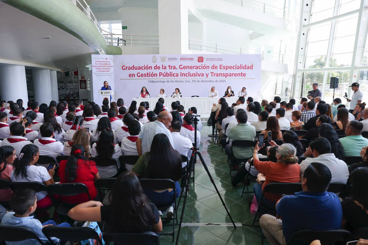 Chilpancingo, Gro., 9 de diciembre de 2025.- “La educación es el mayor instrumento de justicia social; por eso fortalecemos toda la red educativa como un motor estratégico en la era digital”, afirmó la gobernadora Evelyn Salgado Pineda al asistir como madrina de la primera generación a la ceremonia de graduación de las y los estudiantes de la Universidad Virtual del Estado de Guerrero.