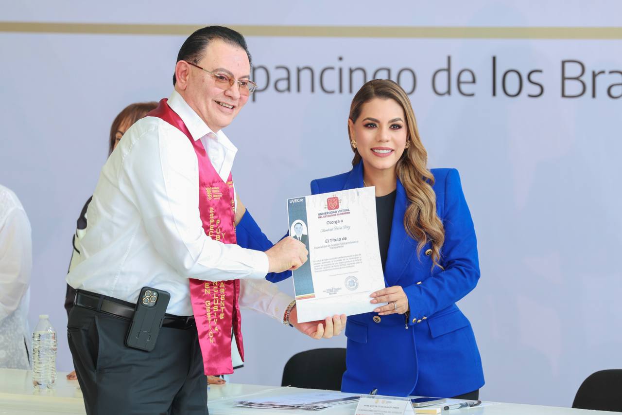 Evelyn Salgado, junto con la rectora de la UVEGRO, Neysi Palmero y el titular de Educación Guerrero, Ricardo Castillo realizó la entrega simbólica de títulos a las y los egresados, destacando que esta institución representa una oportunidad de crecimiento personal y profesional.