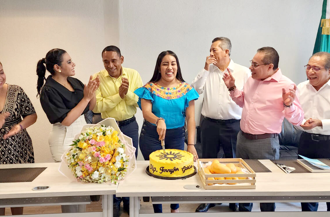 Un agradable festejo de cumpleaños le brindaron sus compañeros (as) legisladores (as) a la diputada del PRD Jennyfer García Lucena, en la sala de juntas del Grupo Parlamentario del PRD en el Congreso del Estado de Guerrero, a donde le llevaron un delicioso pastel, el cual antes de partir, Jennyfer pidió un deseo al apagarle la velita.