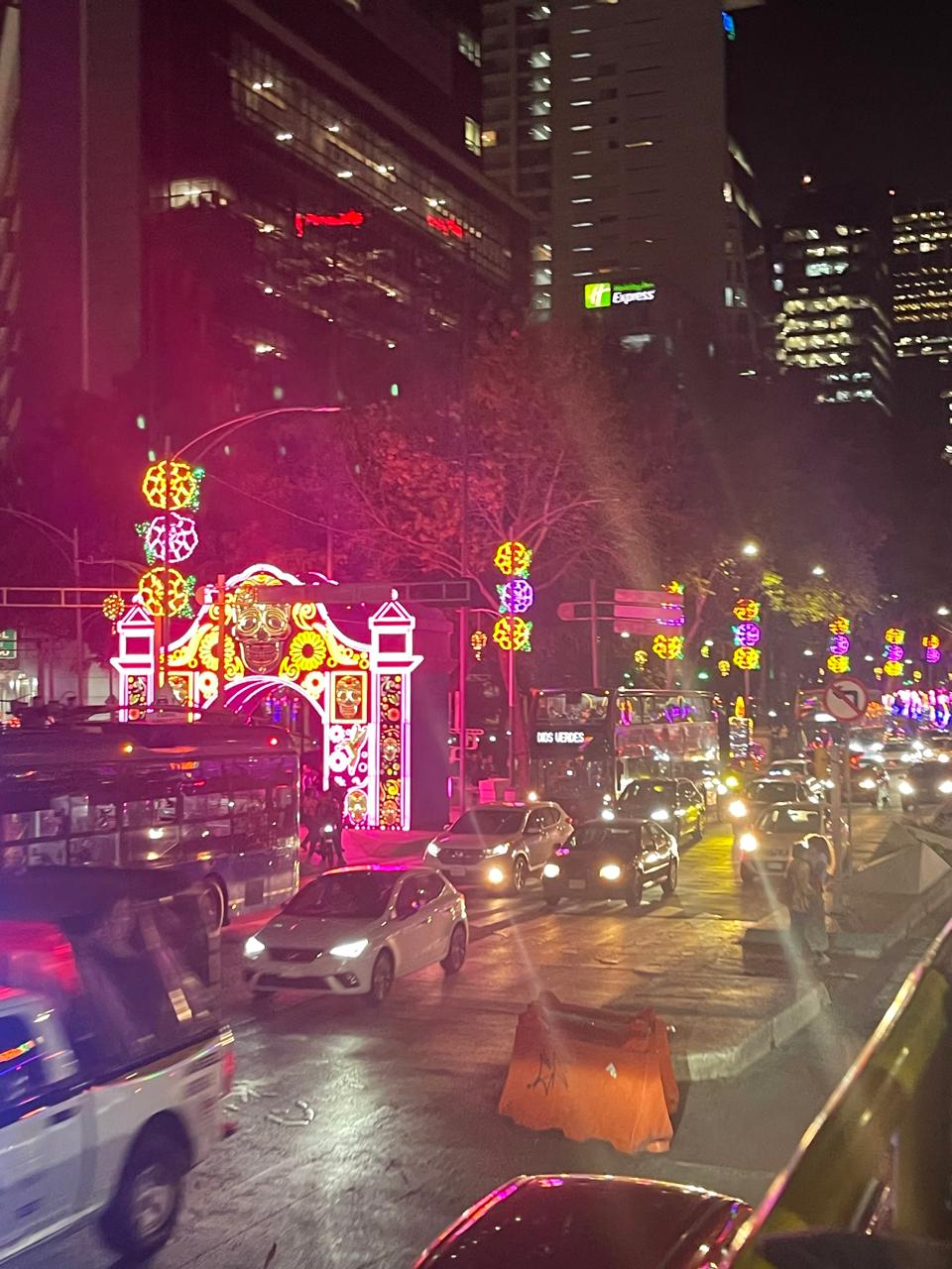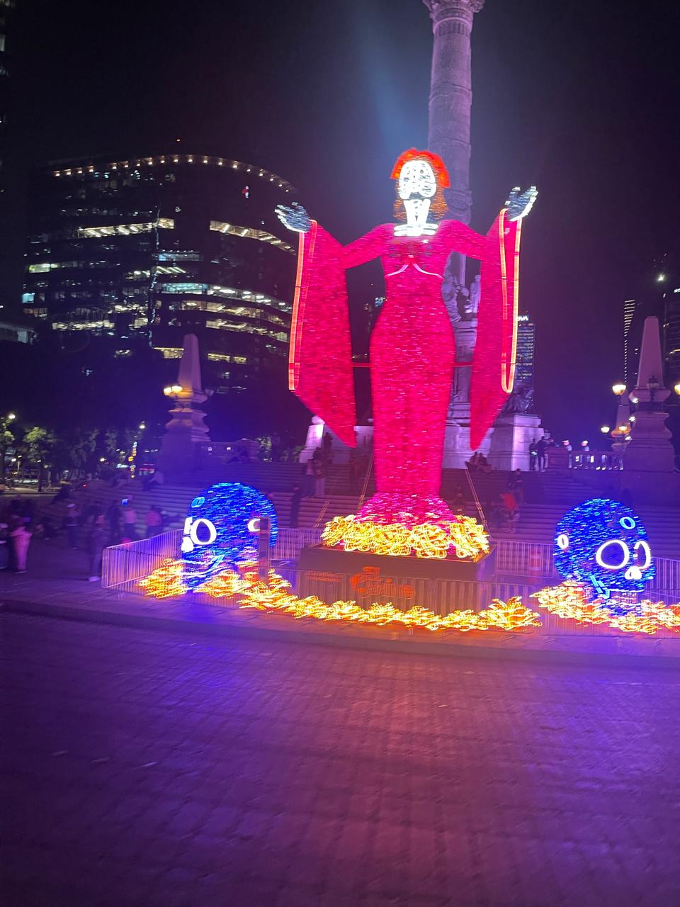 El recorrido iniciamos en el Paseo de la Reforma, una de las avenidas más emblemáticas de la ciudad. Durante el Día de Muertos, sus glorietas se transforman en un festival visual de calaveras gigantes iluminadas, la exposición de alebrijes, asi como admirar los monumentos históricos como el Ángel de la Independencia, la Diana Cazadora y la Glorieta de Colón.