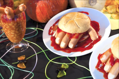 Aquí el pan es tipo telera o bollo, dejando salir los “dedos” de salchicha, en éstos haz un pequeño corte donde van las uñas, retirando un poco de la salchicha y poniendo queso blanco, al final colocas el pan y decoras con cátsup. ¡Qué miedo!