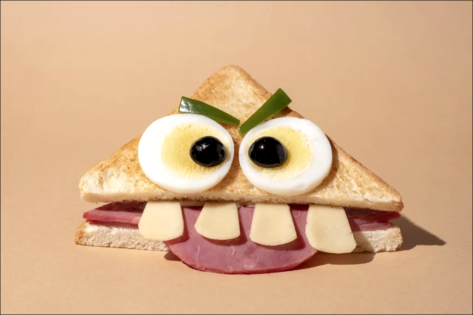 Rellena el medio sandwich con jamón cocido y queso en rebanadas. Asegúrate de que sobresalga una rebanada de jamón con forma de lengua y otra de queso de la que saldrán varios dientes.