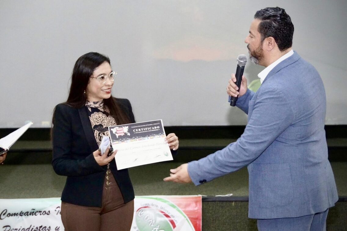 Al finalizar su participación, recibió un reconocimiento por parte del Dr. José Luis Pérez Ramírez, vicepresidente internacional de CONAPE, y de Raúl González Nova, presidente y fundador de esta organización. En su mensaje final, reiteró que “El periodismo no debe ceder ante la desinformación, ni perder la esperanza, sino defender la verdad con más y mejor periodismo”.
