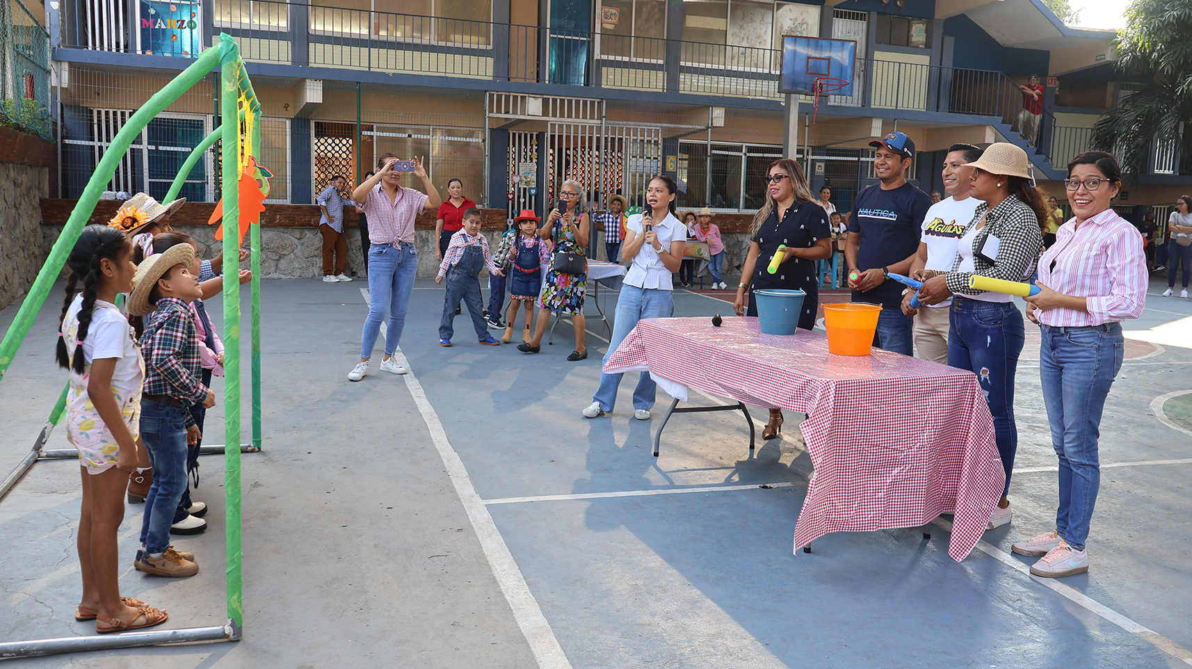 “Las frutas, verduras y vegetales son importantes para una buena alimentación”, afirmó la maestra, mientras invitaba a los padres a participar en una dinámica donde mojaron a sus hijos con pistolas de agua para enseñar que el agua es esencial para todo ser vivo.
