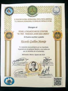 En una emotiva ceremonia, Guillén Memije recibió el Premio Latinoamericano de Literatura “Dr, Prof. Francisco Javier Licea Linares”, otorgado por el Colectivo Cultural Internacional Utopía Poética Universal y el Programa Internacional de Homenajes Virtuales en Vida. Este premio, que resalta el poder transformador de la palabra escrita, no solo reconoce su destacada aportación literaria, sino también su compromiso con la promoción de una cultura de desarrollo personal a través de su obra.