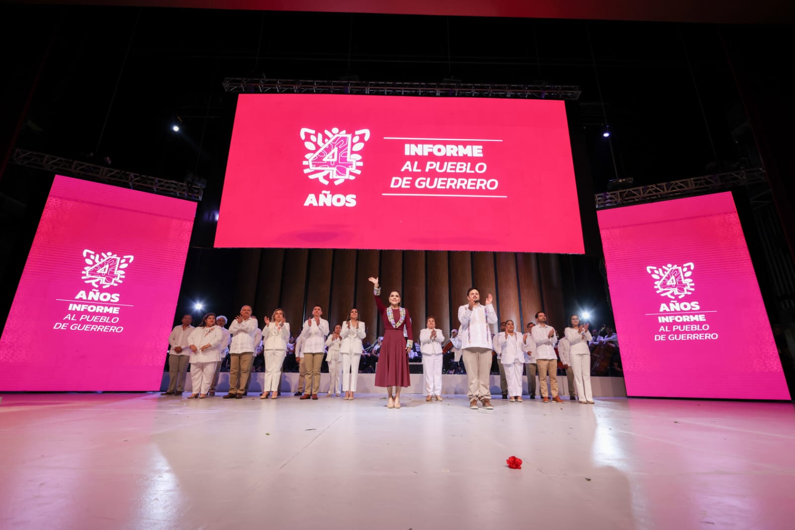 En el Auditorio “Sentimientos de la Nación”, en este acto histórico, la primera gobernadora de Guerrero subrayó los resultados en los cinco ejes de su administración: Infraestructura para el bienestar; bienestar, igualdad y derechos sociales; transformación turística y desarrollo económico; administración y buen gobierno y la estrategia “Transformando Guerrero que han dado resultados tangibles.
