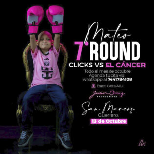 Al término de ese primer round de Click VS el Cáncer, se siguió para ayudar a niños de Acapulco, de Guerrero. Este 7o Round va por Mateo un niño que recibe atención en el Instituto Estatal de Cancerología, pero que requiere de medicamentos y gastos de manutención, a los cuales se dirigirá lo que se logre reunir en esta ocasión. “Vamos a ver cuánto le juntamos a ese Guerrero”, nos dice emocionado el acapulqueño con una reconocida carrera profesional en la fotografía Juan Oms.